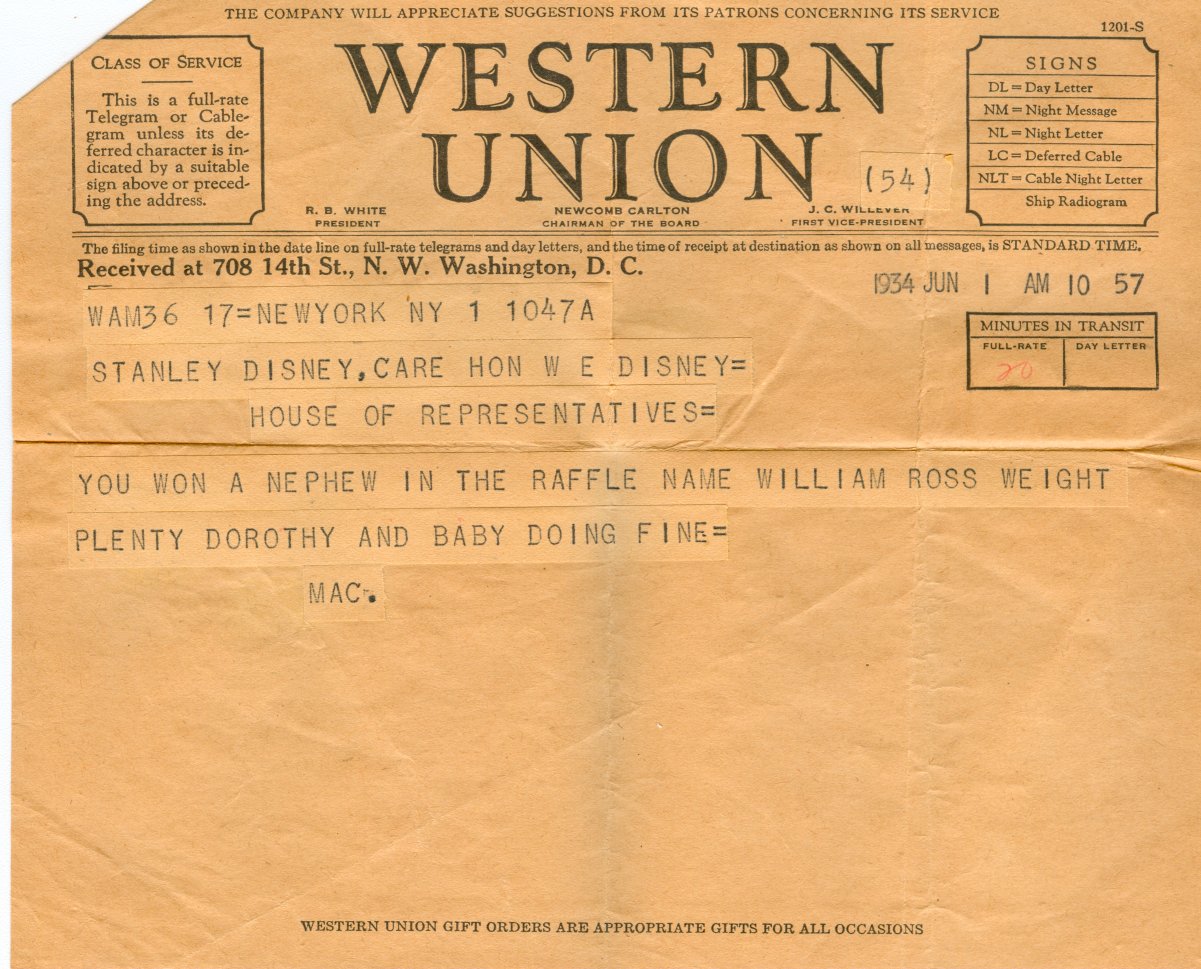 My father was very close to his Uncle Wesley Ernest Disney and called him "Unk" in his letters. He also used his middle name Ernest rather than Wesley. Wesley Ernest Disney was a U.S. Representative from Oklahoma. The town of Disney Oklahoma was named for him because he built a dam there. The United States House of Representatives (or simply the House) is one of the two chambers of the United States Congress; the other is the Senate. |