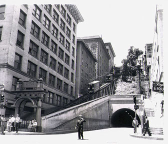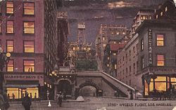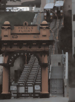 Angel's Flight (open 6 a.m. to 12:15 a.m., round trip fare 5¢) at 3rd and Hill St is a funicular railway transporting passengers 315 feet up and down the steep slope of Bunker Hill between Hill and Olive Streets. During the 1920's it carried as high as 12,000 passengers a day. [2] |