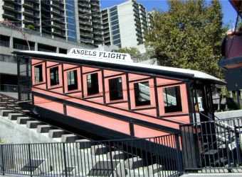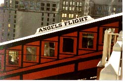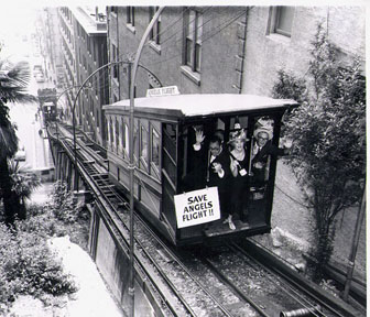 1] El Pueblo Grande by John D. Weaver, printed privately page 73. [2] (Los Angeles, A guide to the City and its Environs; compiled by the Workers and Writers Program of the Works Project Administration in Southern California published 1941 [3] The basic principle of funicular operation is that two cars are attached to each other by a cable, which runs through a pulley at the top of the incline. Counterbalancing of the two cars, with one ascending and one descending the slope — especially when transporting similar loads, such as passengers — minimizes the energy needed to lift the ascending car. [4] http://en.wikipedia.org/wiki/Angels_Flight