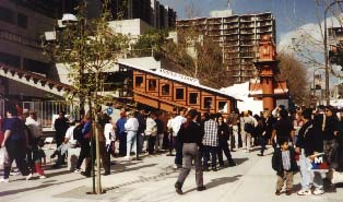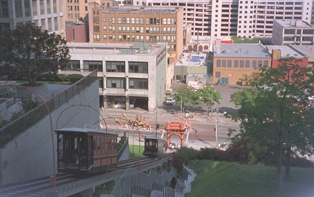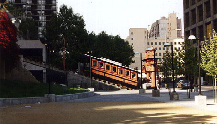 After 27 years in storage, the funicular was rebuilt and reopened in 1996 a half block south of the original site. Although the original cars were used, a brand new track and haulage system was designed and built, a redesign which had unfortunate consequences five years later. As rebuilt, the funicular was 91 meters (298 feet) long on an approximately 33-percent grade. Car movement was controlled by an operator inside the upper station house, who was responsible for: visually determining that the track and vehicles were clear for movement, closing the platform gates, starting the cars moving, monitoring the operation of the funicular cars, observing car stops at both stations, and collecting fares from passengers. The cars themselves did not carry any staff members. Angels Flight was added to the National Register of Historic Places on October 13, 2000. [4] |